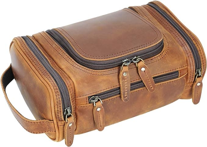 Crafted from full-grain leather with YKK zippers, this Polare dopp kit offers a touch of luxury for your essentials. The spacious design features a large main compartment, additional pockets, and water-resistant lining to keep everything organized and protected. Dimensions: 10.6"L x 6.7"W x 4.7"H. Bonus: 1-year